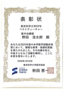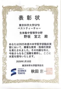 2025年度東京科学大学医学部臨床実習(SPB部門)におけるベストティーチャー賞を当部の野坂宜之准教授と野田浩太郎特任助教が受賞し表彰されました。